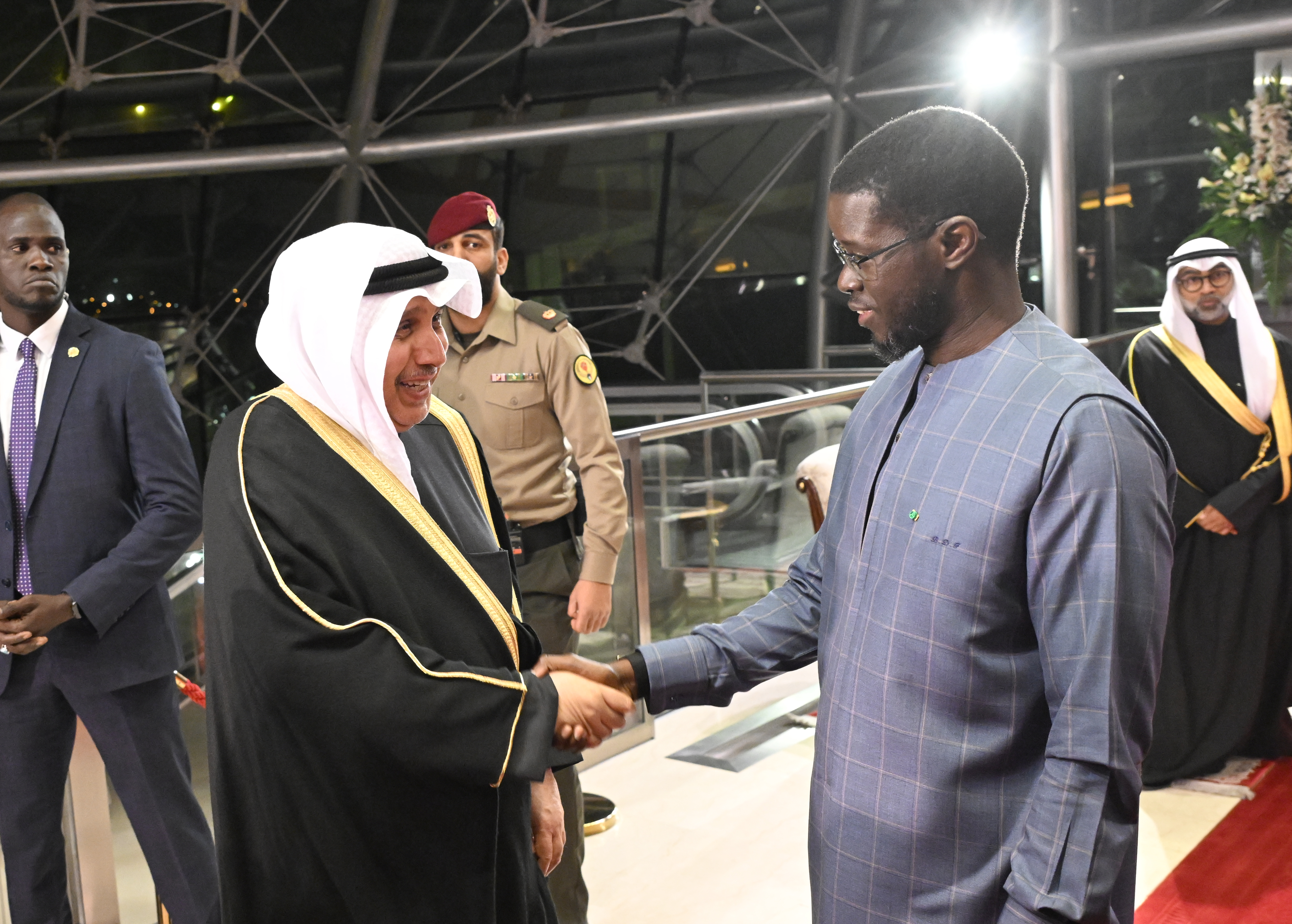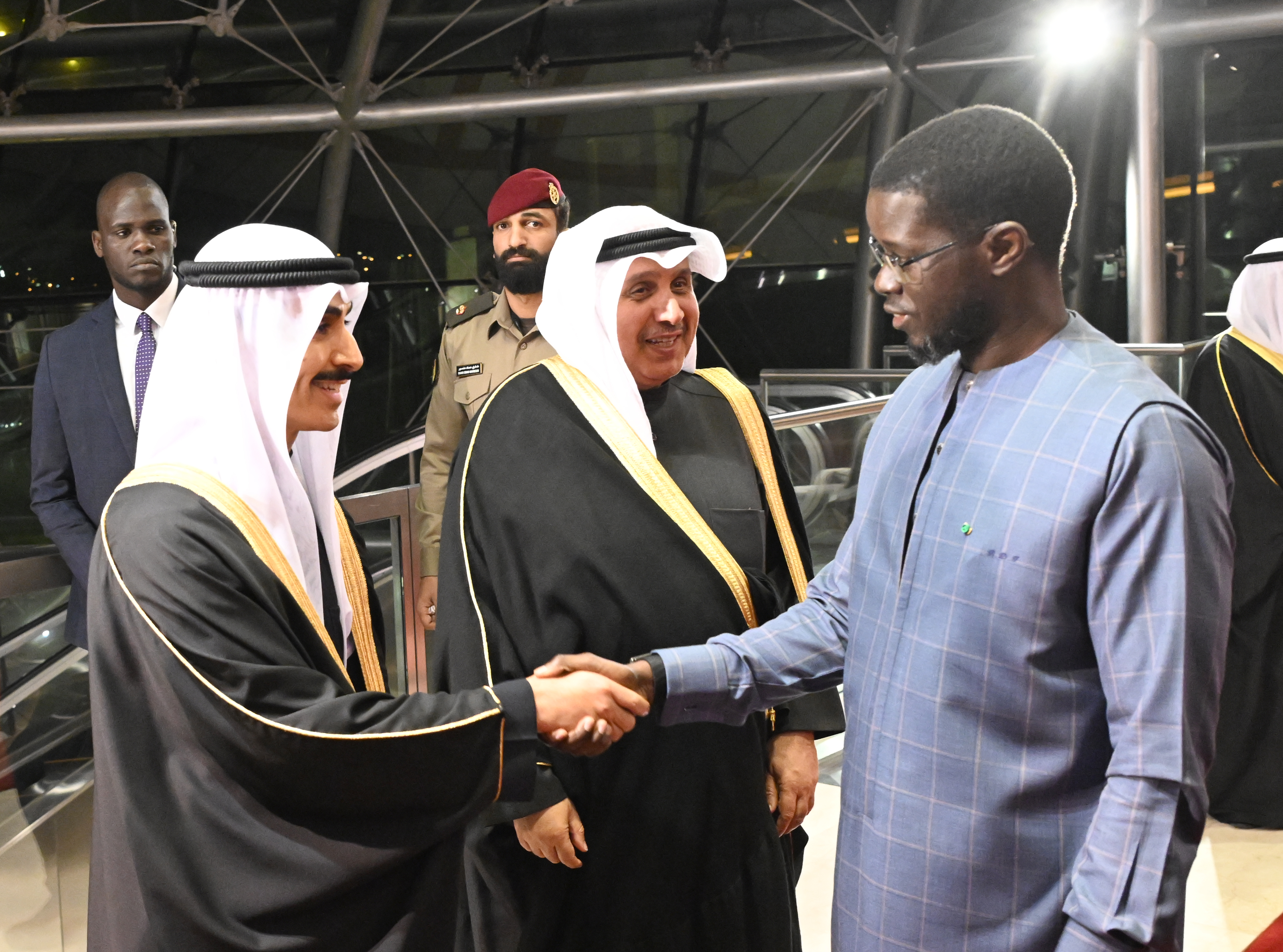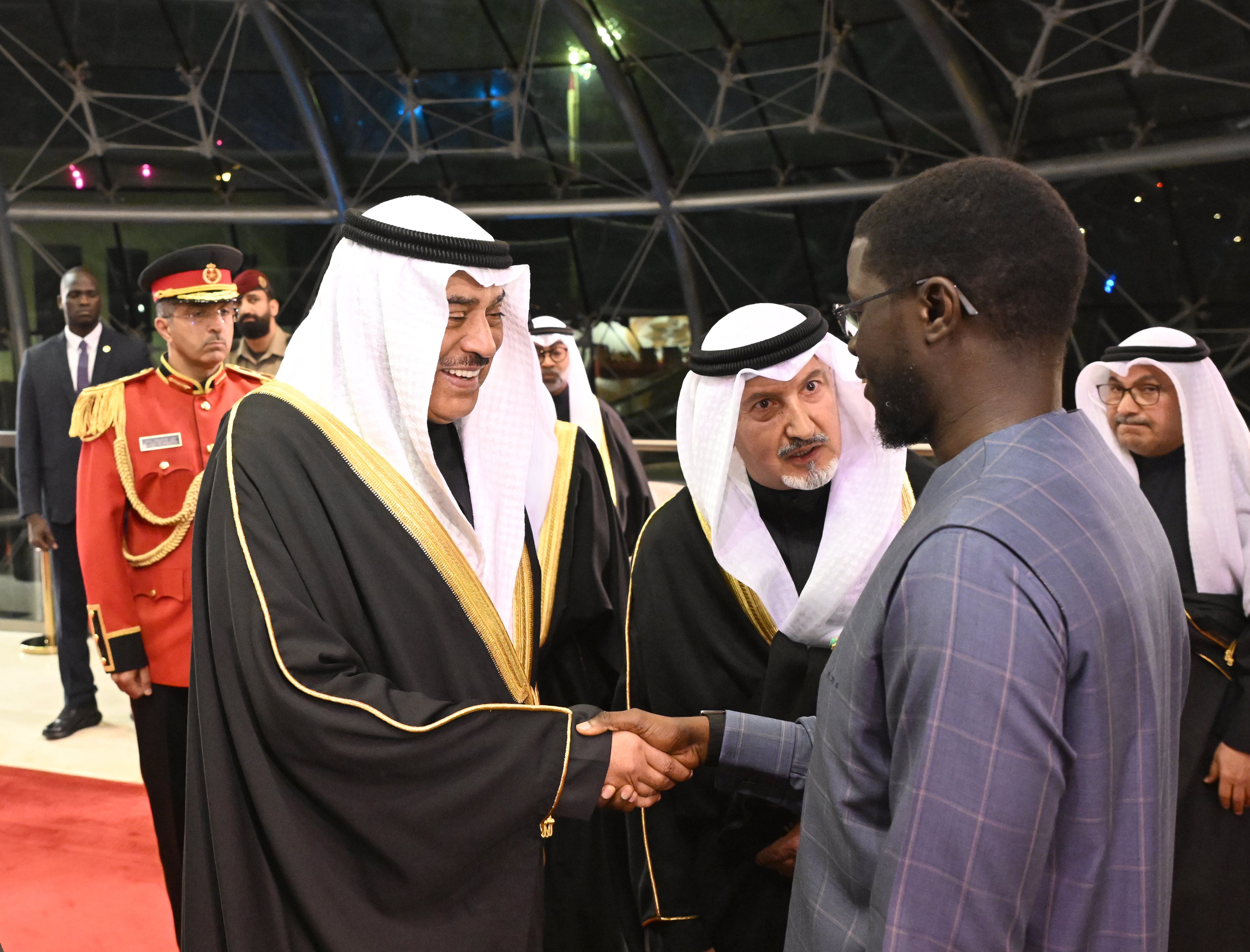 سمو ولي العهد الشيخ صباح خالد الحمد الصباح خلال استقباله الرئيس بشيرو جوماي فاي رئيس جمهورية السنغال لدى وصوله إلى البلاد في زيارة رسمية