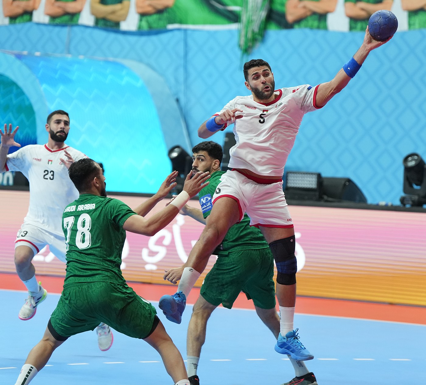 وواصل المنتخب السعودي عروضه القوية في المنافسات الآسيوية محققا الفوز على حساب المنتخب الإماراتي في مباراة كانت الافضلية فيها لـ(الأخضر) الذي أنهى الشوط الأول متقدما (15-11) وفي الشوط الثاني لم يترك المنتخب السعودي أي فرصة لعودة نظيره الإماراتي إلى المباراة ليحقق فوزا ثمينا في مشواره الآسيوي.