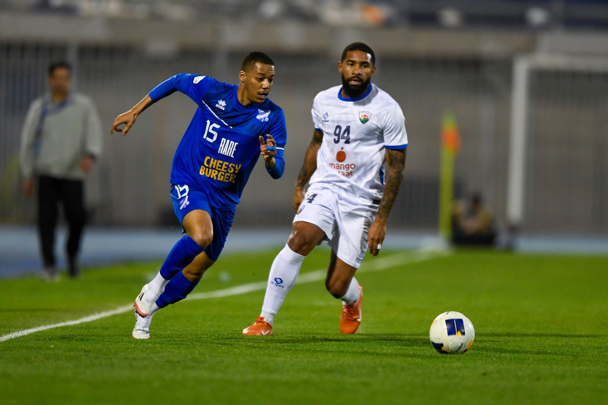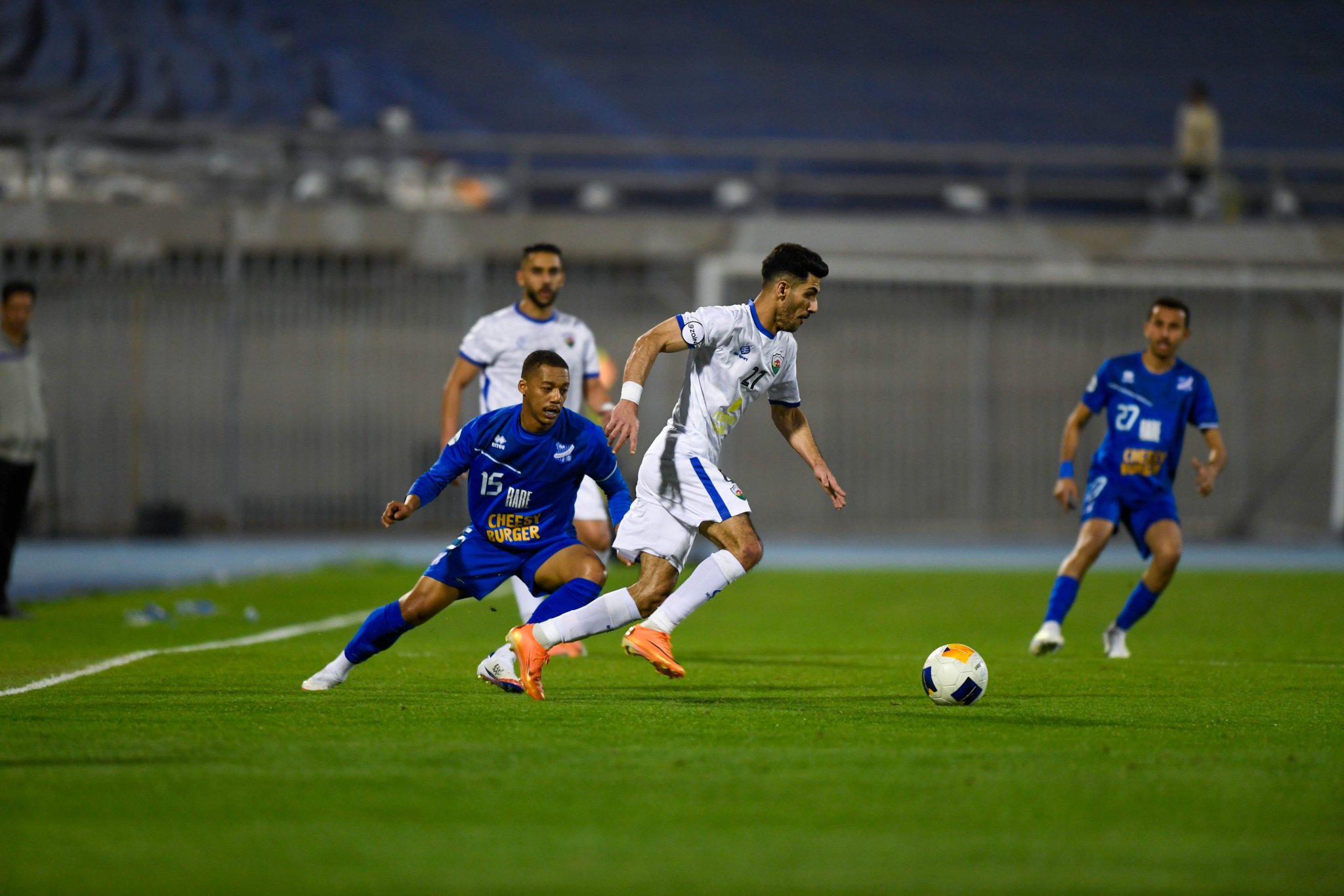 لاعب الجهراء يحاول الحفاظ على الكرة وسط مضايقة من لاعب التضامن