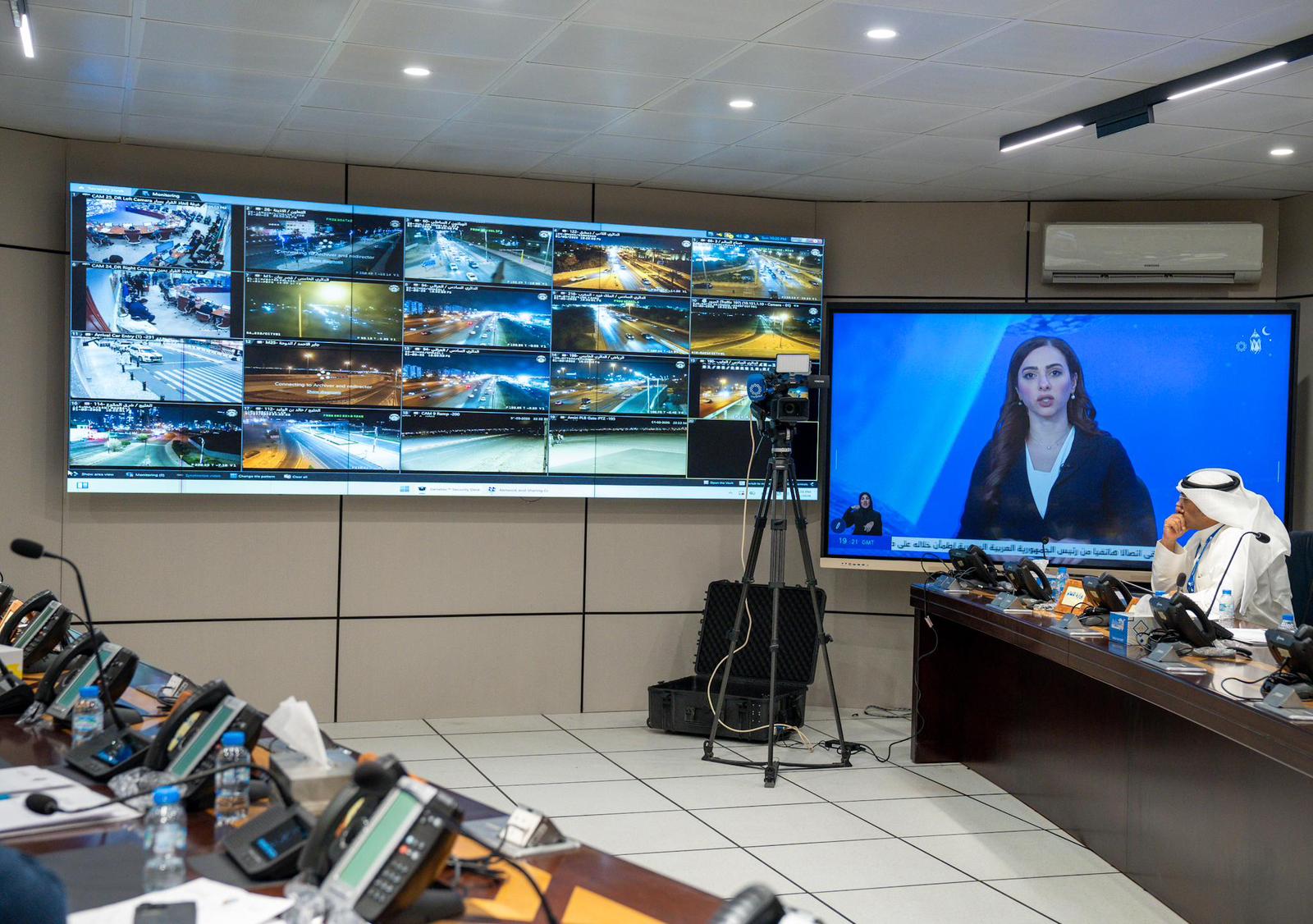 The operations room includes civilian and military representatives working 24 hours to provide requirements, respond to inquiries, and operate monitoring screens overseeing roads and vital locations across the country with constant coordination among agencies.