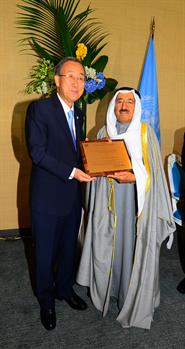 من جانبه قال الامين العام للامم المتحدة بان كي مون ان جهود سمو أمير البلاد الشيخ صباح الاحمد الجابر الصباح حفظه الله ورعاه مكنت الامم المتحدة من مواجهة ما شهده العالم من معاناة وحروب وكوارث في الاعوام الماضية.