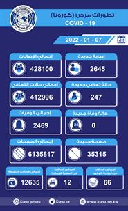 الكويت – 7 - 1 (كونا) -- أعلنت وزارة الصحة اليوم الجمعة تسجيل 2645 إصابة جديدة بفيروس كورونا المستجد (كوفيد19) في الساعات ال24 الماضية ليرتفع بذلك إجمالي عدد الحالات المسجلة في البلاد الى 428100.