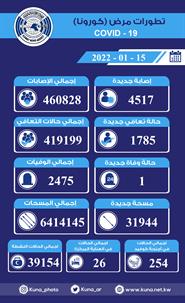 الكويت - 15 - 1 (كونا) -- أعلنت وزارة الصحة الكويتية اليوم السبت تسجيل 4517 إصابة جديدة بفيروس كورونا المستجد (كوفيد 19) في الساعات ال24 الماضية ليرتفع بذلك إجمالي عدد الحالات المسجلة في البلاد الى 460828.