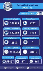 الكويت - 6 - 2 (كونا) -- أعلنت وزارة الصحة اليوم الاحد تسجيل 4232 إصابة جديدة بفيروس كورونا المستجد (كوفيد 19) في الساعات ال24 الماضية ليرتفع بذلك إجمالي عدد الحالات المسجلة في البلاد إلى 578819.