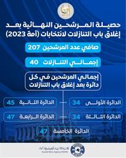 الكويت - 30 - 5 (كونا) -- أغلق باب التنازل لانتخابات مجلس الأمة 2023 المقرر عقدها في السادس من يونيو المقبل اليوم الثلاثاء على اجمالي عدد المرشحين المتنازلين البالغ عددهم 40 مرشحا ليبلغ صافي المرشحين والمرشحات بعد طلبات التنازل 207 مرشحين.