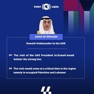 ABU DHABI, Nov 9 (KUNA) -- Kuwaiti Ambassador to the UAE Jamal Al-Ghunaim touted the upcoming visit by the President of the Emirates Sheikh Mohammad bin Zayed Al-Nahyan to the State of Kuwait, which would bolster the strong ties.