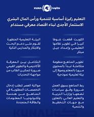 وتمضي الكويت بثبات في سعيها لإعداد جيل من المتعلمين القادرين على الابتكار والمنافسة في سوق العمل إقليميا ودوليا ودعم هذه الجهود بمشاريع مثل تطوير المناهج الرقمية وإدخال التعليم التقني والمهني وتحسين جودة المعلمين بما يتماشى مع مؤشرات التنمية المستدامة وإعادة إعداد المناهج للمرحلتين الابتدائية والمتوسطة.