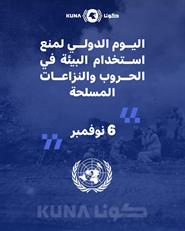 الكويت - 6 - 11 (كونا) -- تشارك الكويت دول العالم الاحتفال بـ(اليوم الدولي لمنع استخدام البيئة في الحروب والنزاعات المسلحة) الذي يصادف السادس من نوفمبر كل عام مستهدفا تسليط الضوء على الآثار المدمرة التي تخلفها الحروب على البيئة الطبيعية.