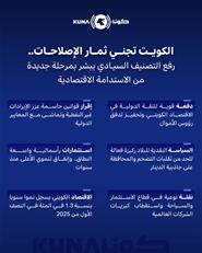 الكويت - 26 - 11 (كونا) -- في وقت شكل رفع وكالة (ستاندرد آند بورز) العالمية يوم الجمعة الماضي التصنيف الائتماني السيادي لدولة الكويت إلى مستوى (-AA) مع نظرة مستقبلية مستقرة تتويجا لزخم الإصلاحات الشاملة والتحول الهيكلي الذي تشهده البلاد فإنه يعطي كذلك مؤشرا على مرحلة مبشرة من الاستدامة الاقتصادية قائمة على خريطة إصلاحات حكومية تحمل تحولا نوعيا في الأجندة الوطنية.