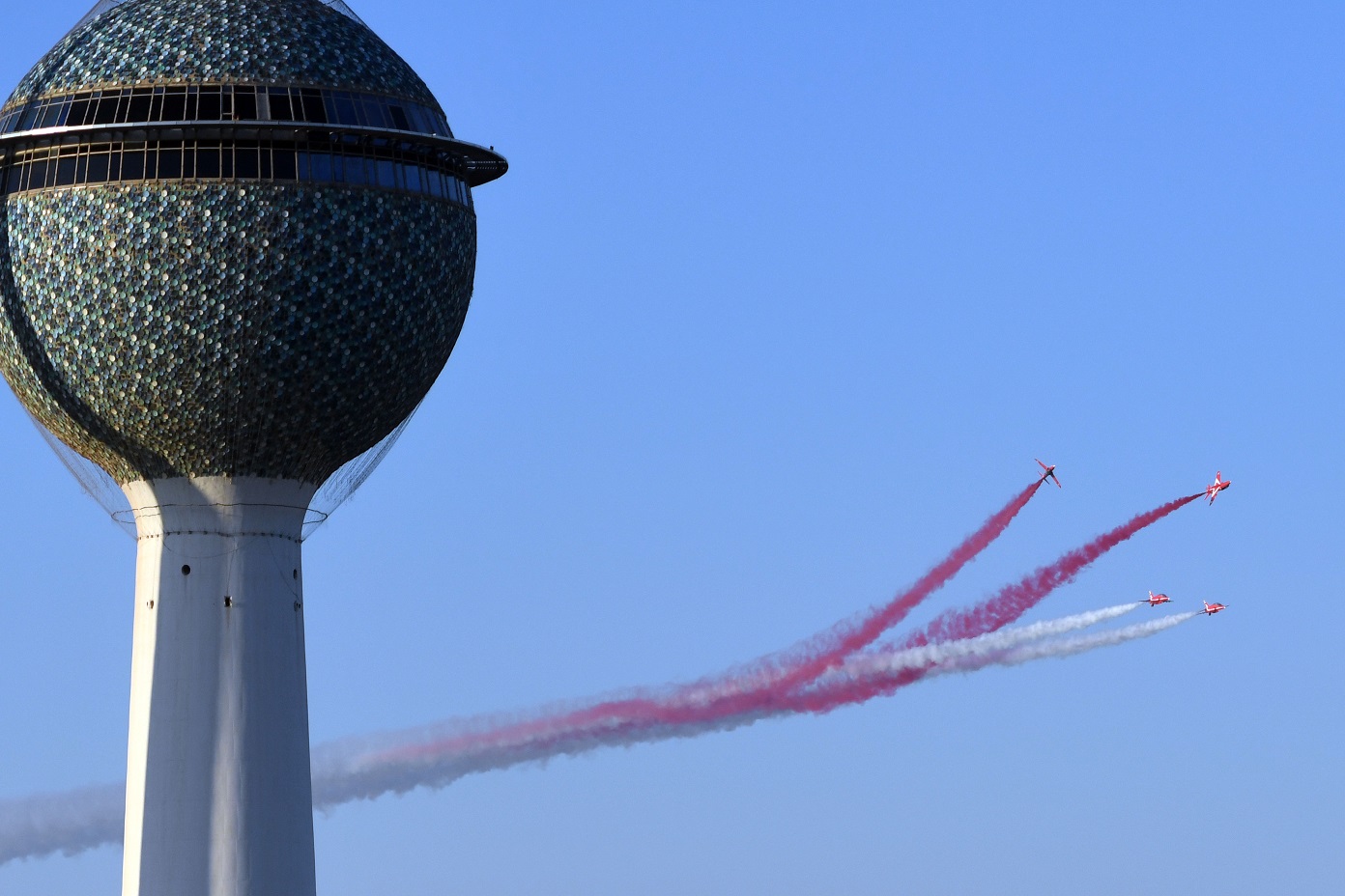 KUWAIT, Nov 21 (KUNA) -- Fighter jets of the British Red Arrows, officially known as the Royal Air Force Aerobatic Team, decorated Kuwait's sky on Monday roaring overhead with dazzling colored smoke trails.