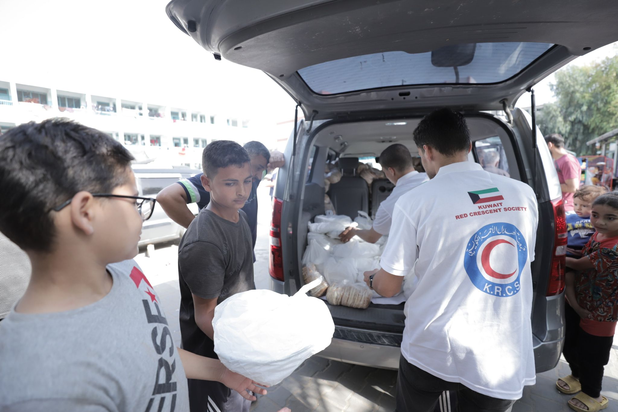 Palestinian volunteer teams affiliated with the KRCS distributed relief aid, hot meals, bread and dates, in addition to medical relief, including supplies for medical services.