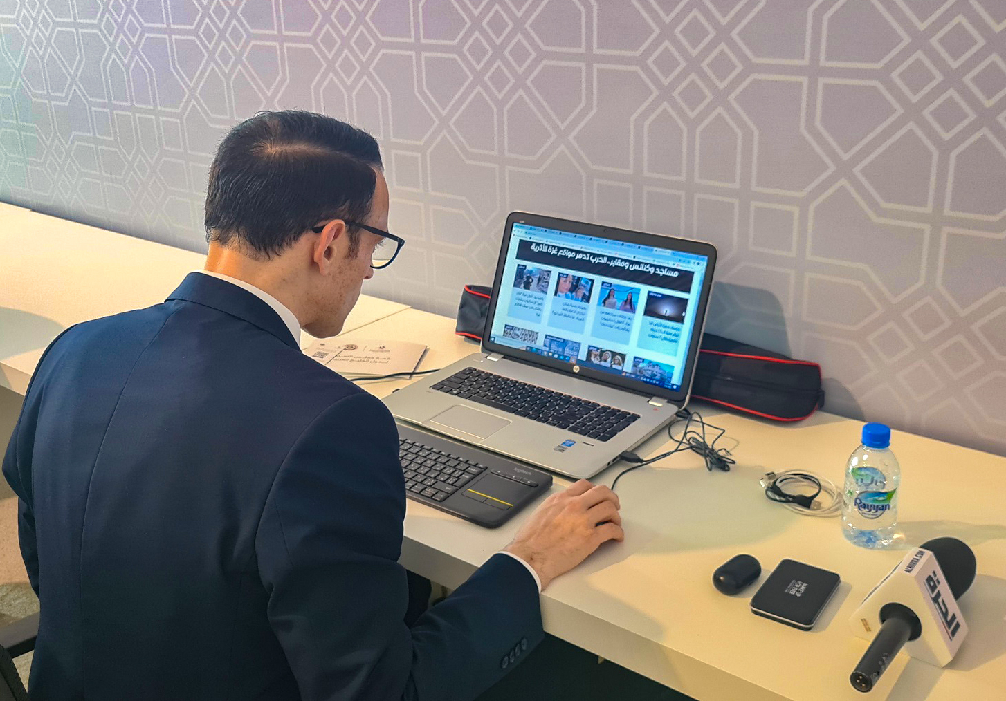 A reporter reporting live at the media center of the 44th GCC Summit