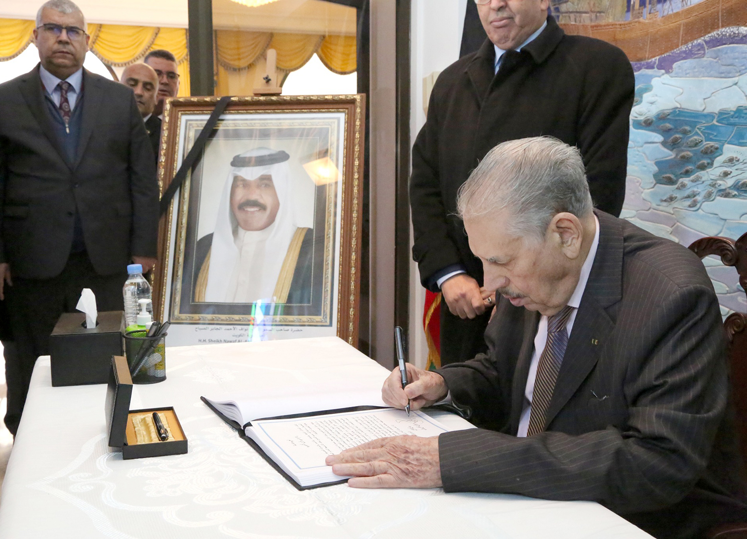 وأعرب رئيس مجلس الأمة الجزائري أثناء التوقيع على سجل التعازي عن "حزنه العميق بوفاة سمو أمير الكويت الشيخ نواف الأحمد الجابر الصباح" معتبرا رحيله "خسارة ليس للكويت فحسب بل للأمة العربية والإسلامية".