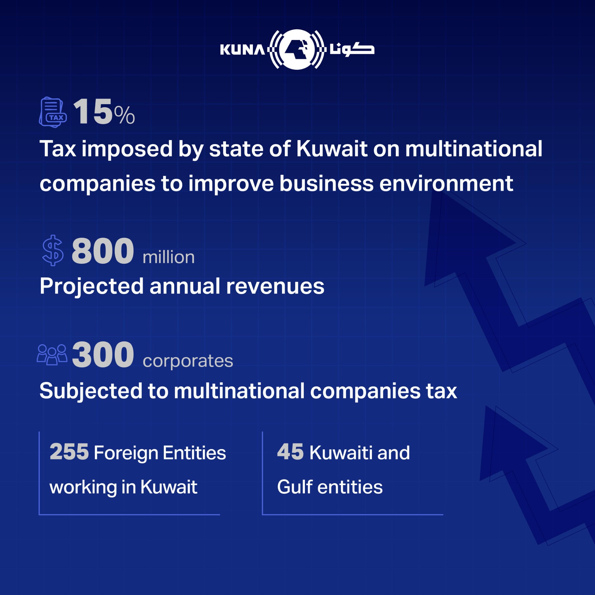 Kuwaiti Minister of Finance and Minister of State for Economic Affairs and Investments Nora Al-Fassam expected the country to earn roughly KD 250 million (around USD 800 million) in estimated taxes per annum as a result of the application of this law.
